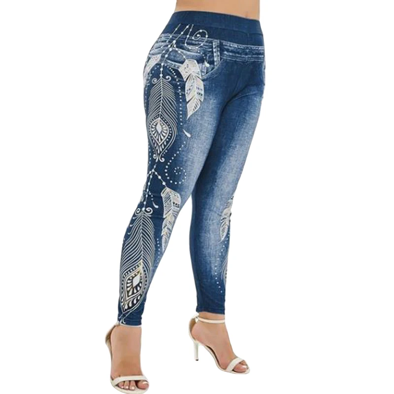 Женские леггинсы, имитация джинсов, цветочный принт, эластичная талия, брюки-карандаш, джеггинсы, джеггинсы, женские спортивные брюки, брюки