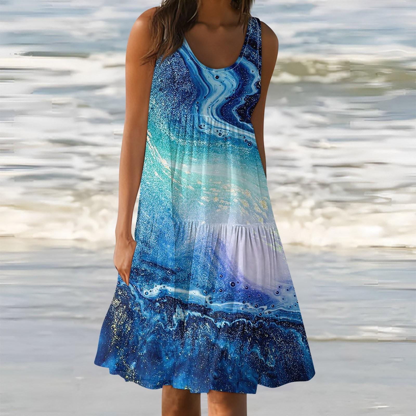 Женские летние весенние плиссированные богемные платья, милые струящиеся пляжные платья без рукавов, прямая футболка, платья-майки, платья с круглым вырезом S