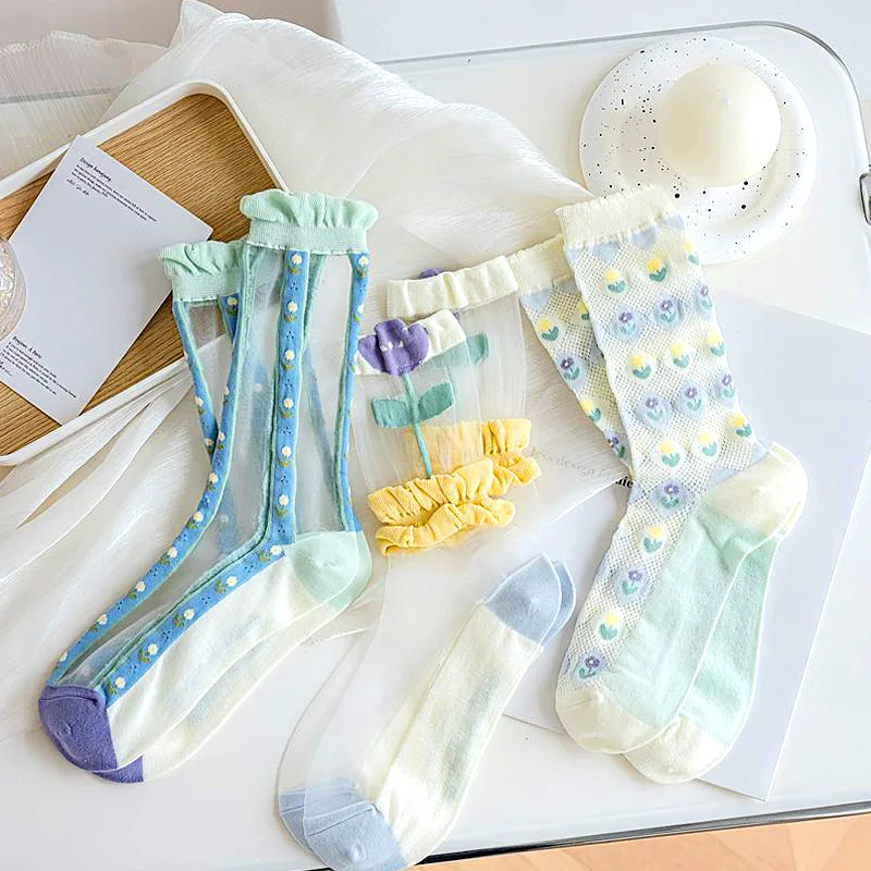 Женские летние носки shion, ультратонкие прозрачные шелковые носки со стеклянными цветами, милые японские кружевные шелковые носки с рюшами и...