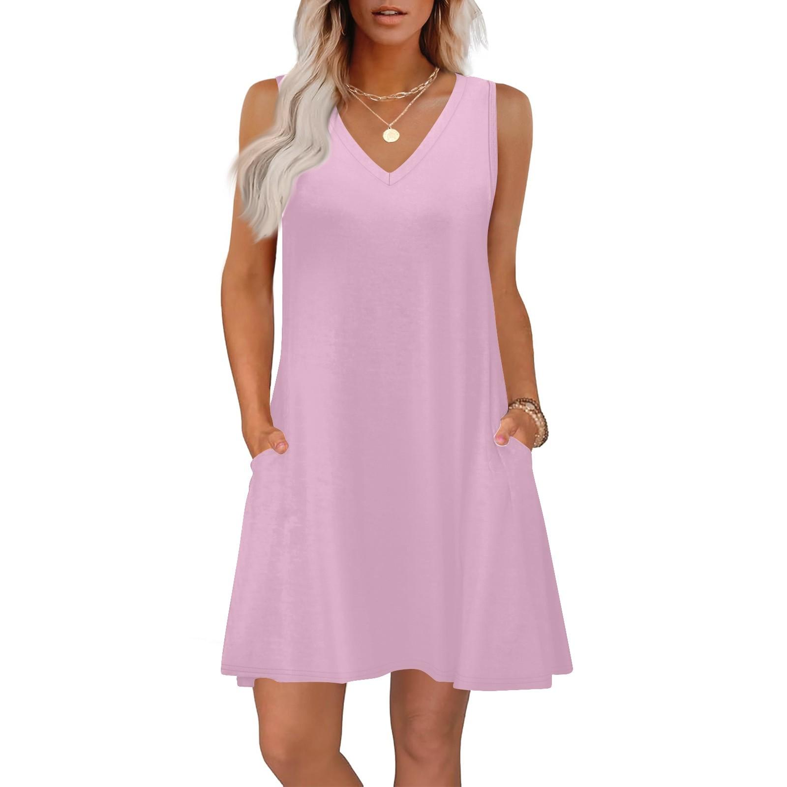Женские летние платья свободного кроя, однотонные, с V-образным вырезом, без рукавов, сарафаны, пляжное гавайское платье с карманами S розовый