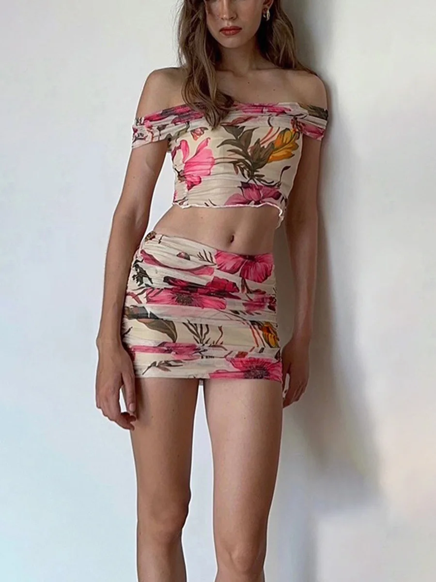 Женские летние сексуальные наряды из 2 предметов, топы-трубы с открытыми плечами и цветочным принтом, мини-юбка