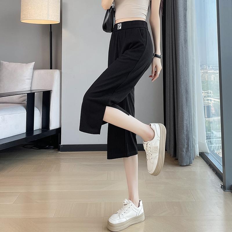 Женские летние узкие широкие брюки из ледяного шелка, тонкие драпированные спортивные прямые брюки для миниатюрных, 7 шт. M чёрный