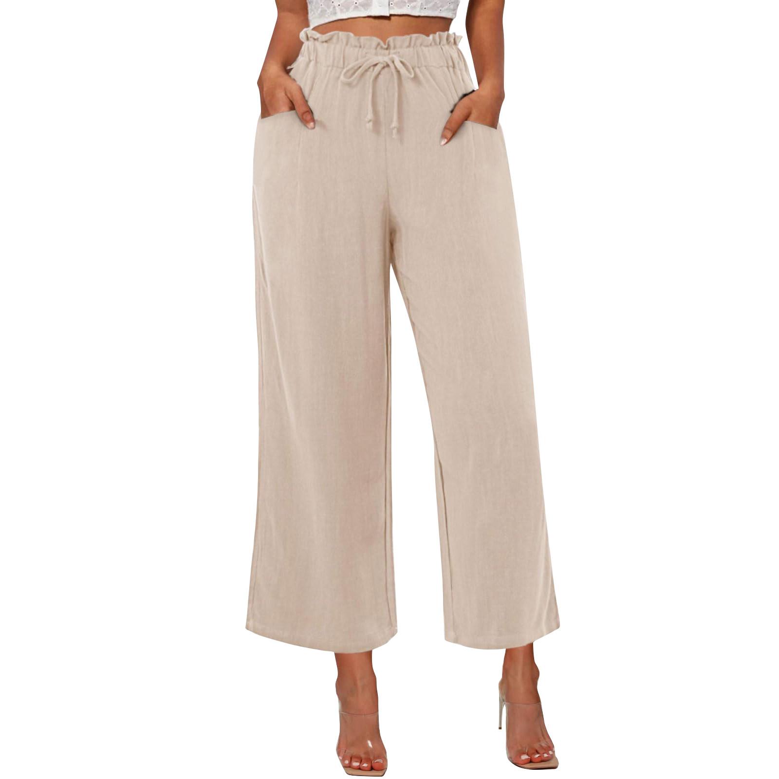Женские льняные брюки с широкими штанинами, эластичные брюки-палаццо с высокой талией, повседневная свободная одежда для пляжного отдыха с карманами S хаки