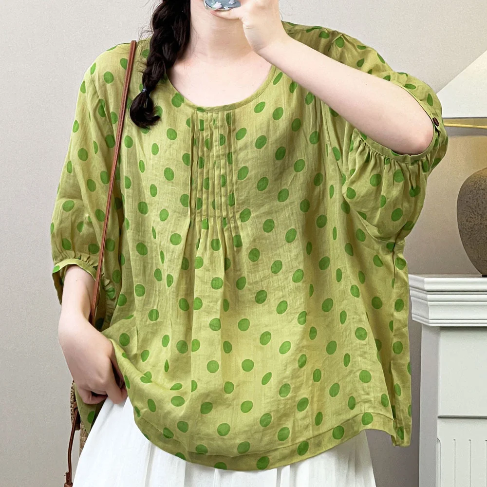 Женские льняные футболки оверсайз, летние винтажные зеленые рубашки в горошек с коротким рукавом, топы большого размера