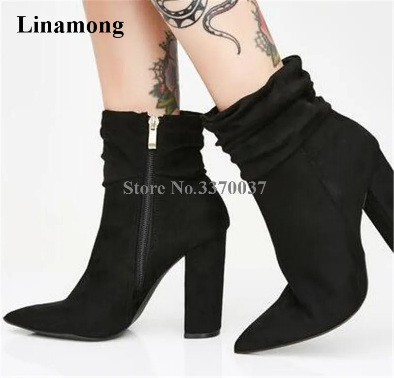 Женские модные замшевые ботильоны на высоком толстом каблуке с острым носком