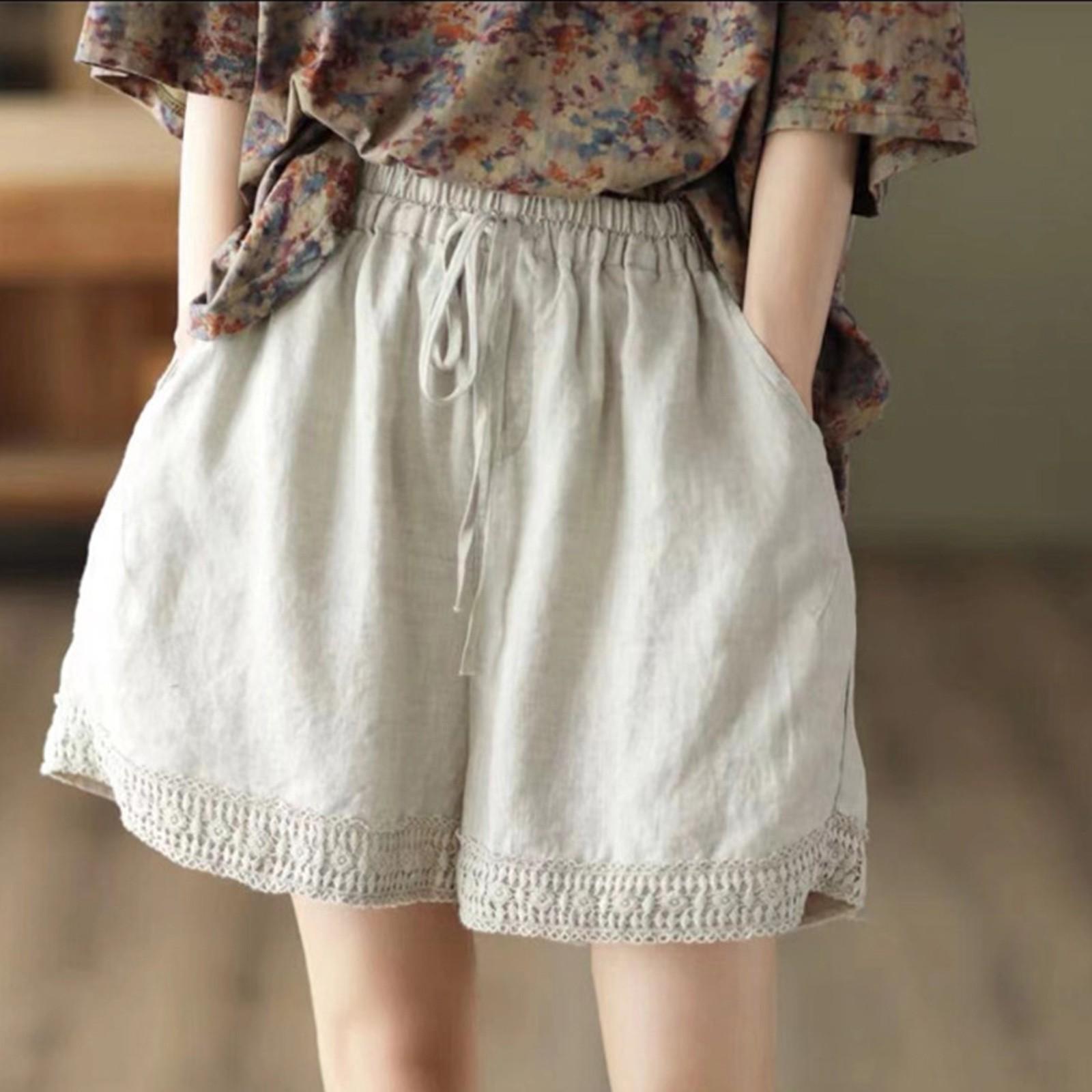Женские модные повседневные полые вязаные крючком прямые шорты из хлопка и льна в стиле ретро L бежевый