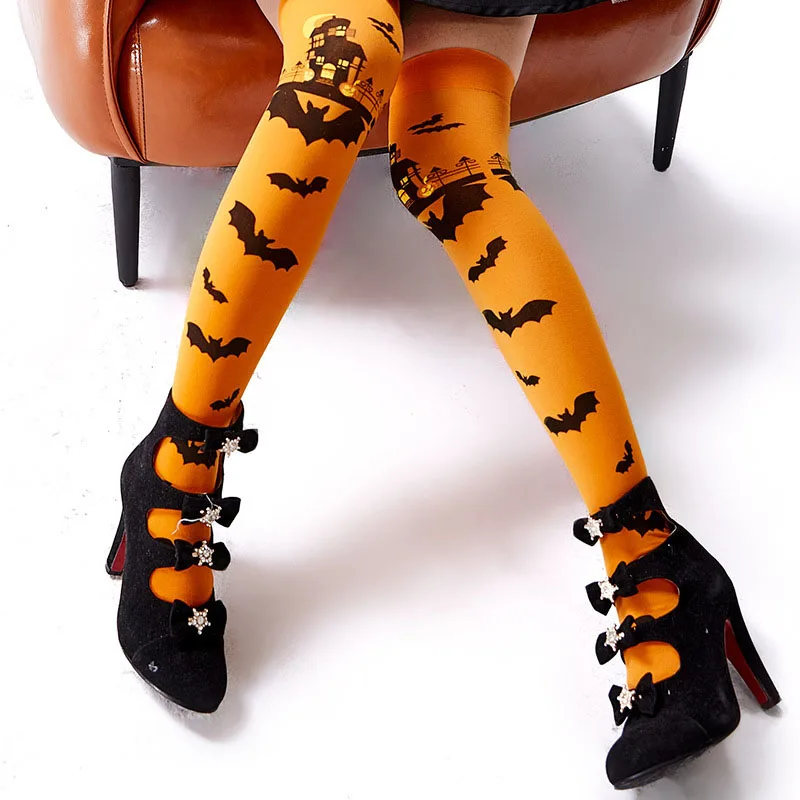 Женские носки Хэллоуин тыква летучая мышь оранжевые носки выше колена фиолетовые японские милые чулки