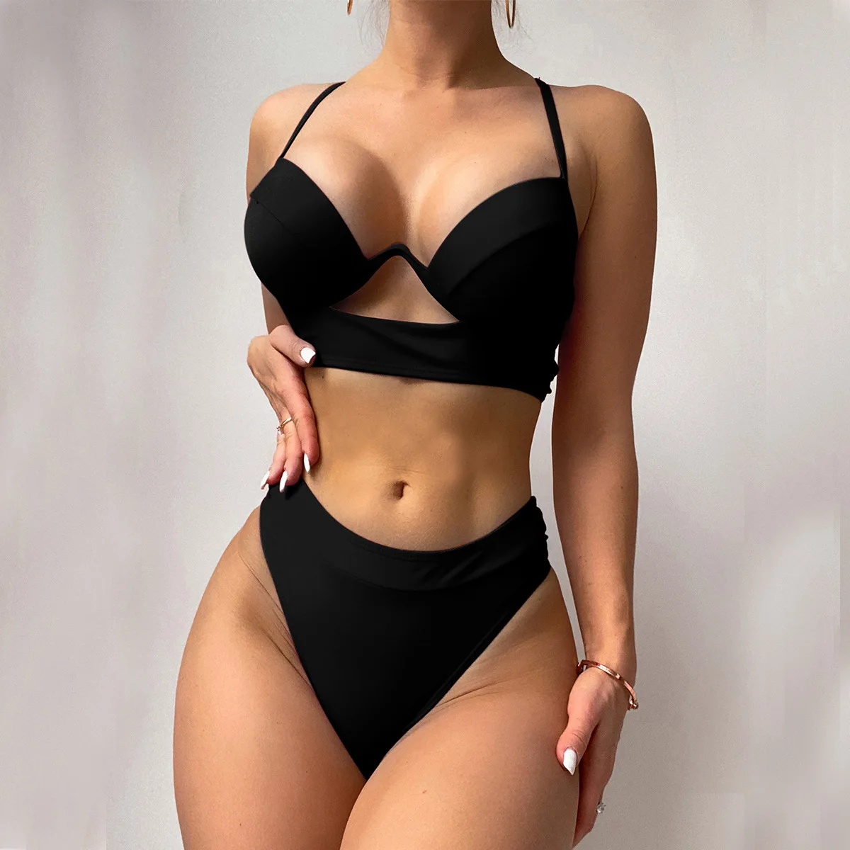 Женские однотонные пляжные купальники, соблазнительные купальники с лямкой на шее, стринги с защитой от ударов, черные, красные, зеленые комплекты бикини, лето 2023