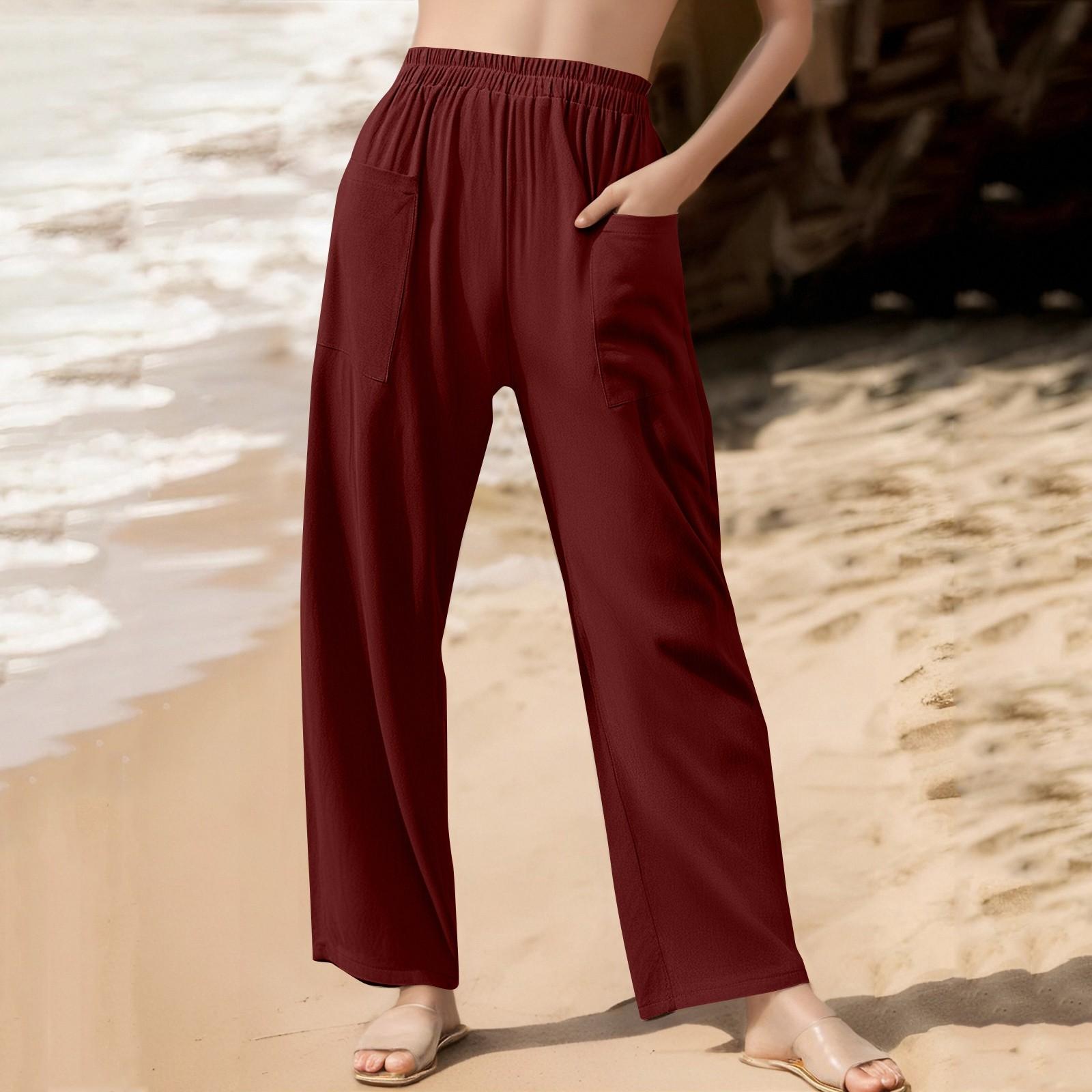 Женские однотонные повседневные брюки прямого кроя из хлопка и льна с высокой талией и свободными карманами на эластичном поясе XL винный