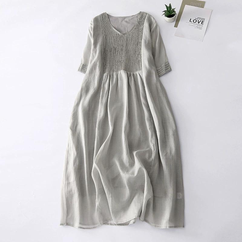 Женские однотонные хлопковые льняные длинные платья с V-образным вырезом, плиссированные, с коротким рукавом, макси-платья с карманом, лето XXL серый