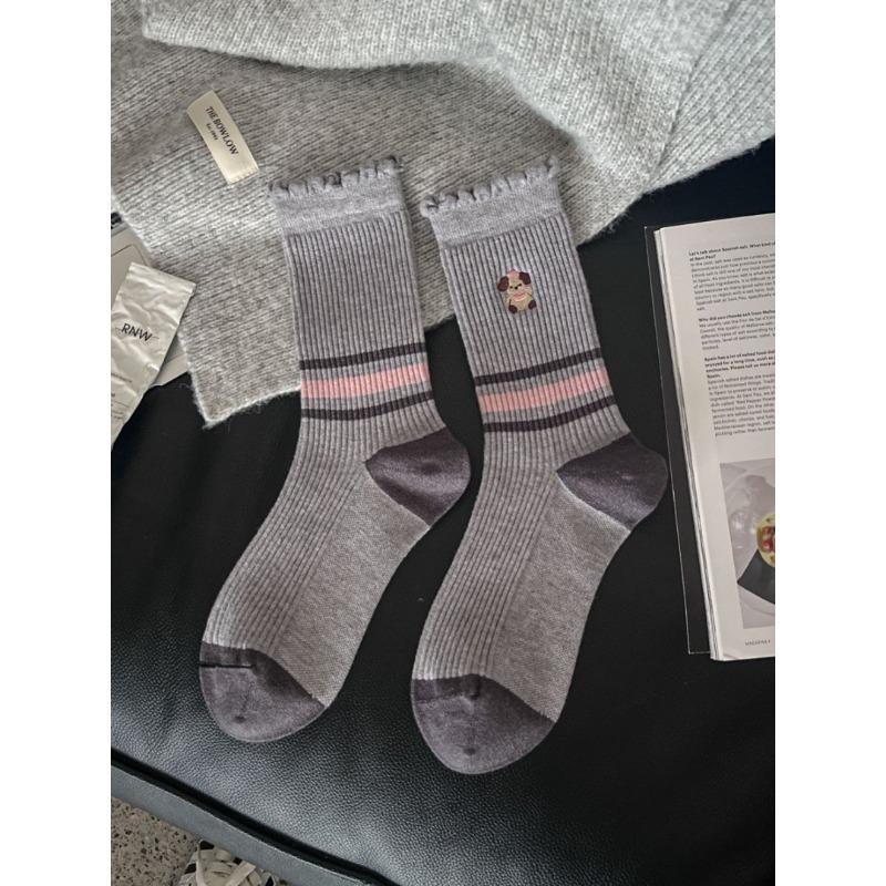 Женские осенне-зимние новые трендовые полосатые носки-трубы с милой мультяшной вышивкой, без косточек 1 pair светло-серый