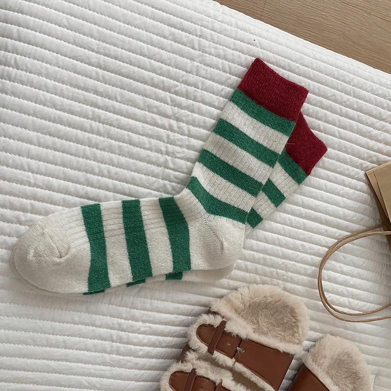 Женские осенне-зимние ретро утолщенные полосатые контрастные шерстяные носки до середины икры с махрой 1 pair белый/зелёный