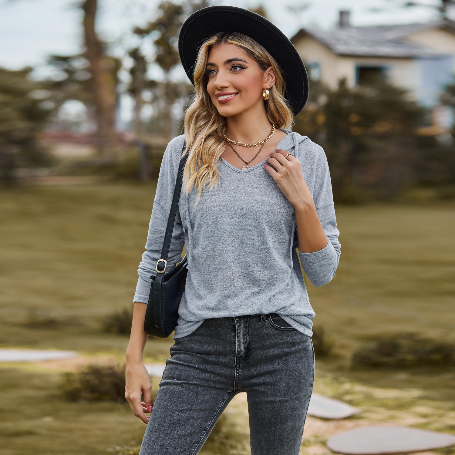 Женские осенне-зимние топы, однотонная повседневная футболка с v-образным вырезом и капюшоном с длинными рукавами S светло-синий