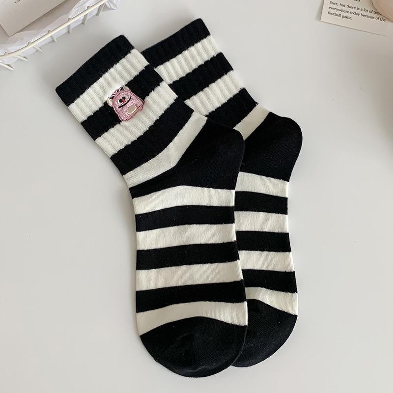 Женские осенние носки средней длины с милой вышивкой в виде мультфильма, универсальный стиль, плотный полосатый хлопок One Size чёрный