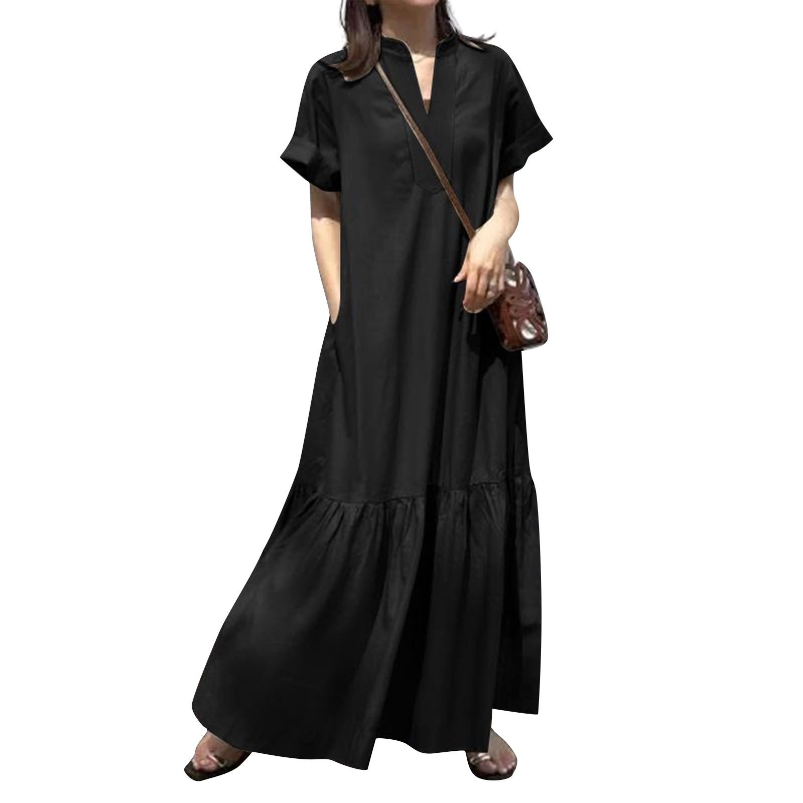 Женские платья с стойкой, коротким рукавом, V-образным вырезом, повседневные, свободные, с длинными рукавами, с А-силуэтом M чёрный
