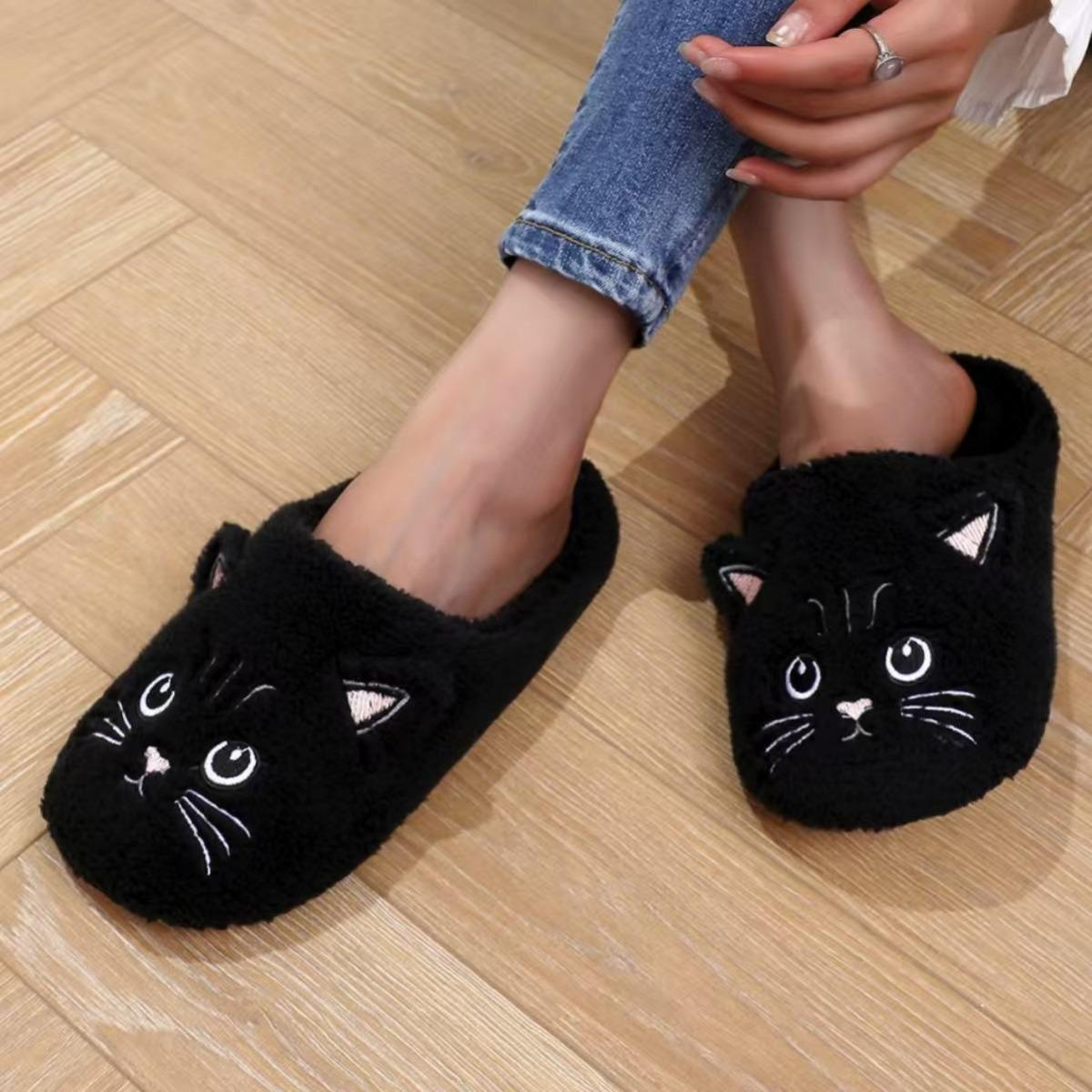Женские плюшевые тапочки-кошки - Зимние теплые нескользящие домашние тапочки для дома с милым мультяшным дизайном котенка, мягкая подошва из ЭВА и уютная ткань, милые тапочки 38-39 чёрный