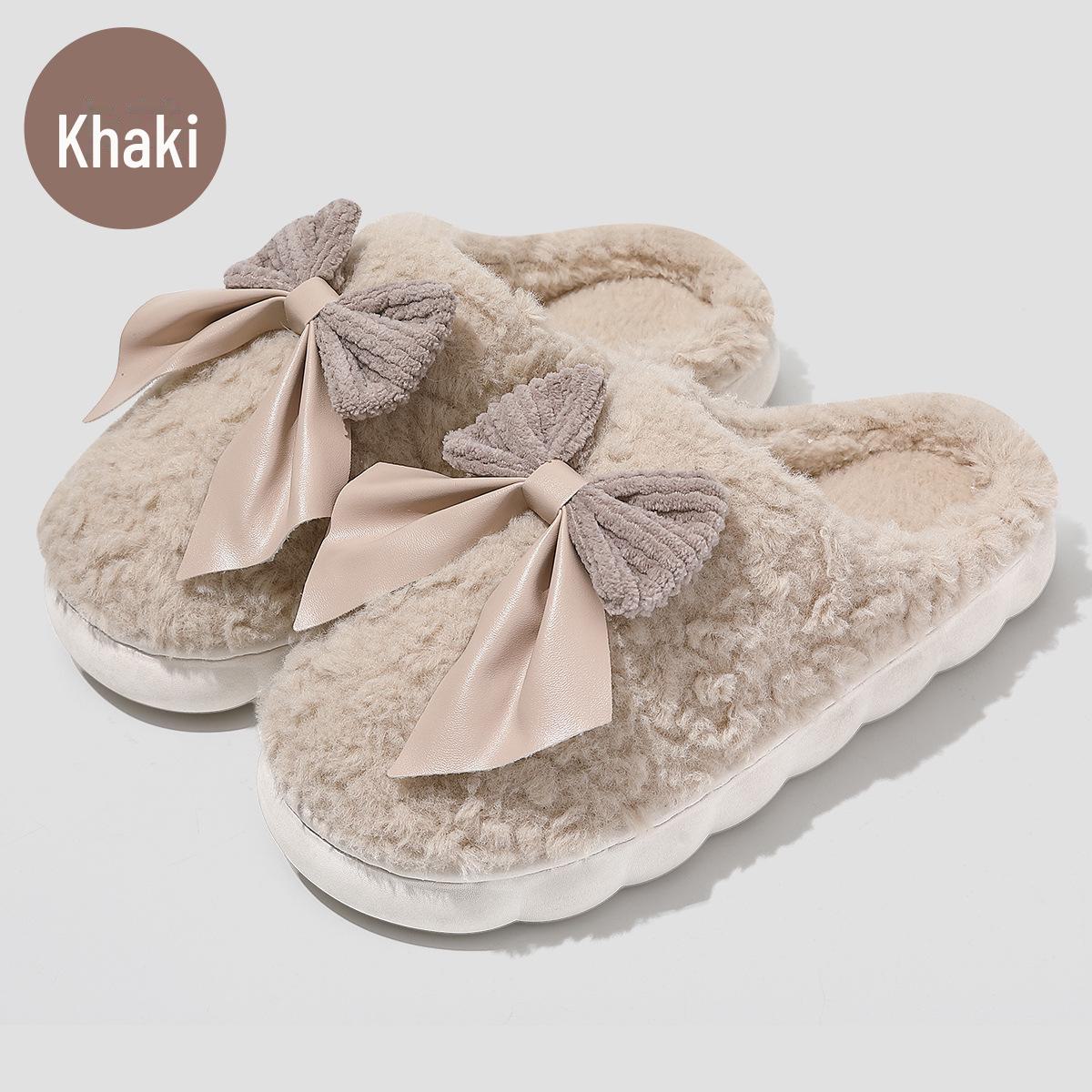 Женские плюшевые тапочки с бантом из хлопка - толстая подошва, теплая домашняя обувь для осени и зимы 38-39 is suitable for 37-38 (inner length 23.5CM) хаки