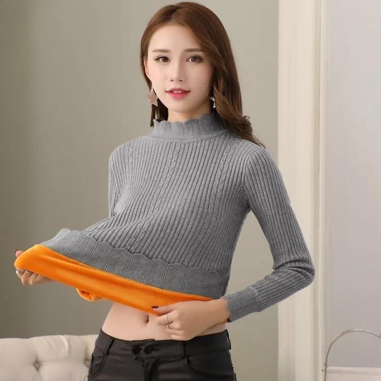 Женские плюшевые тонкие свитера с высоким воротом, женские осенне-зимние повседневные однотонные вязаные пуловеры большого размера с длинными рукавами S серый