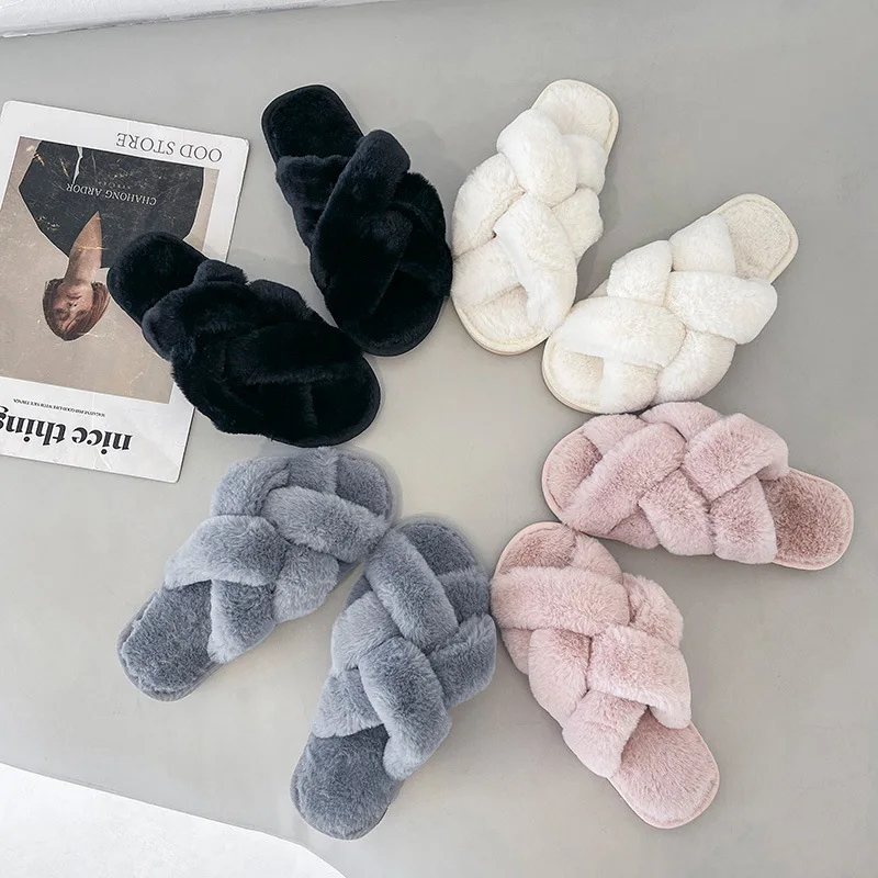 Женские плюшевые шлепанцы, мягкая обувь с перекрестными ремешками, на платформе, с открытым носком, теплые хлопковые тапки, Осень-зима