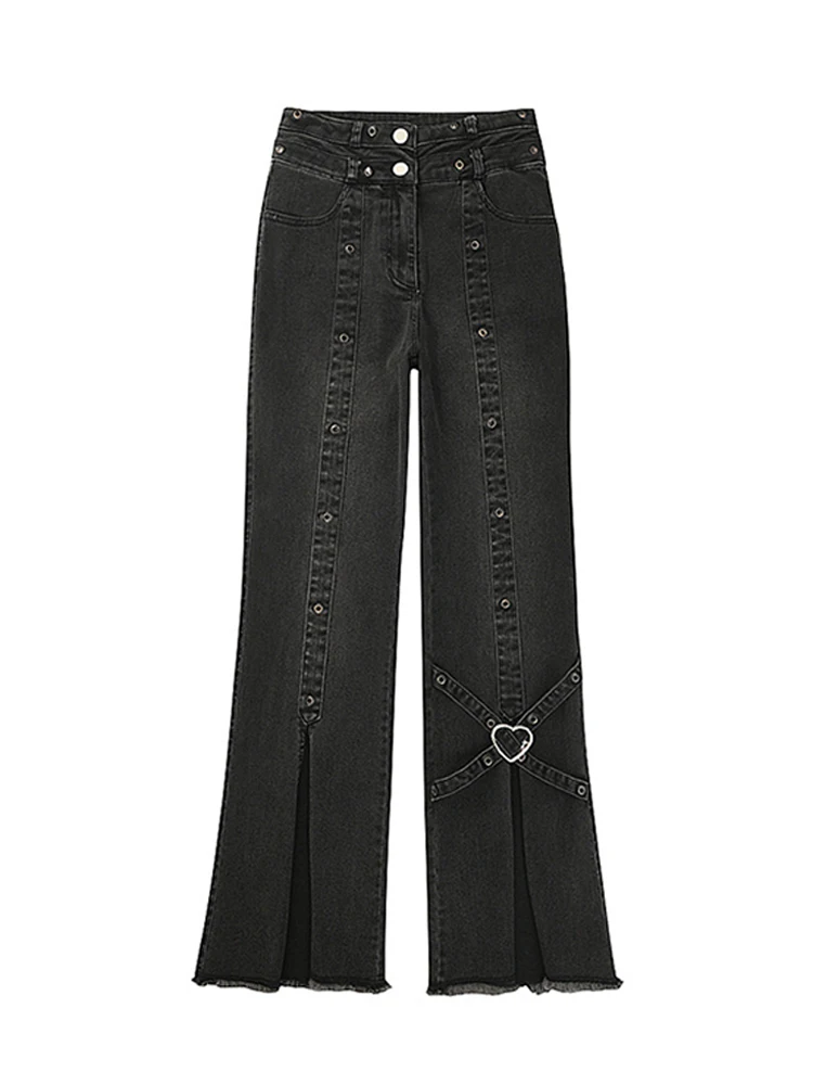 Женские прямые джинсовые брюки, брюки из денима с высокой талией и разрезом, украшенные сердечками, в готическом стиле, 2023