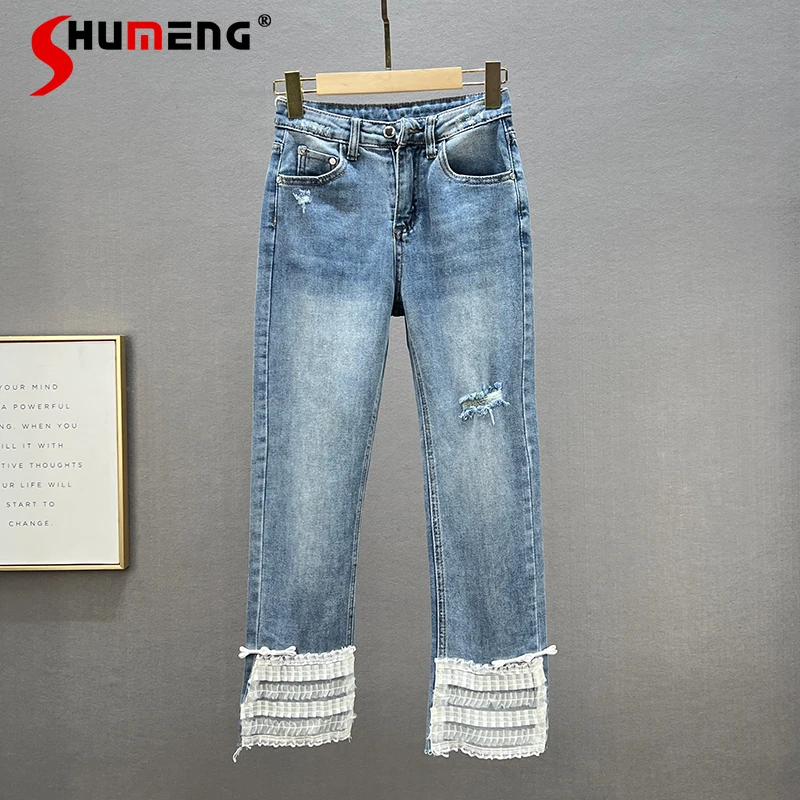 Женские прямые джинсы с завышенной талией, облегающие кружевные джинсовые брюки в уличном стиле, весна-лето 2022