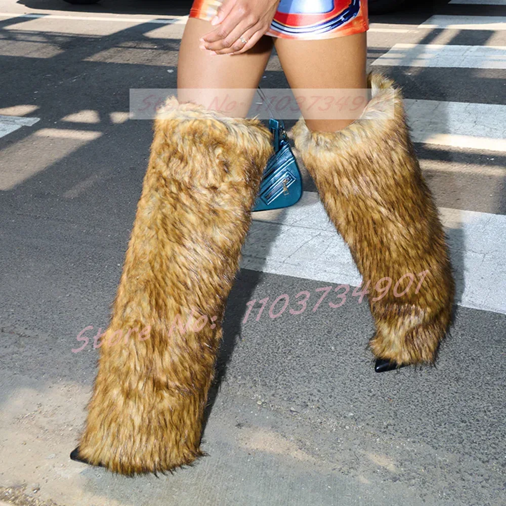 Сапоги до колена с пушистым мехом, женские модные вечерние туфли без шнуровки с острым носком, большие размеры, туфли на высоком каблуке, женские изящные теплые ботинки в уличном стиле