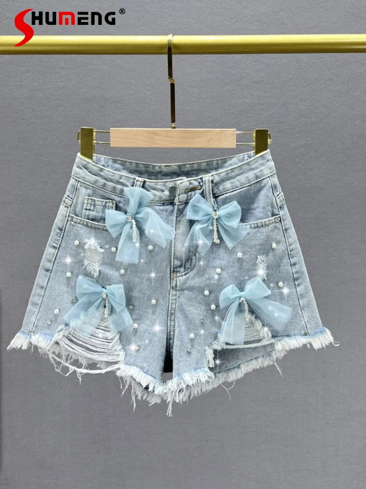 Женские рваные джинсы с бантом, голубые брюки трапециевидной формы с широкими штанинами и высокой талией, лето 2023