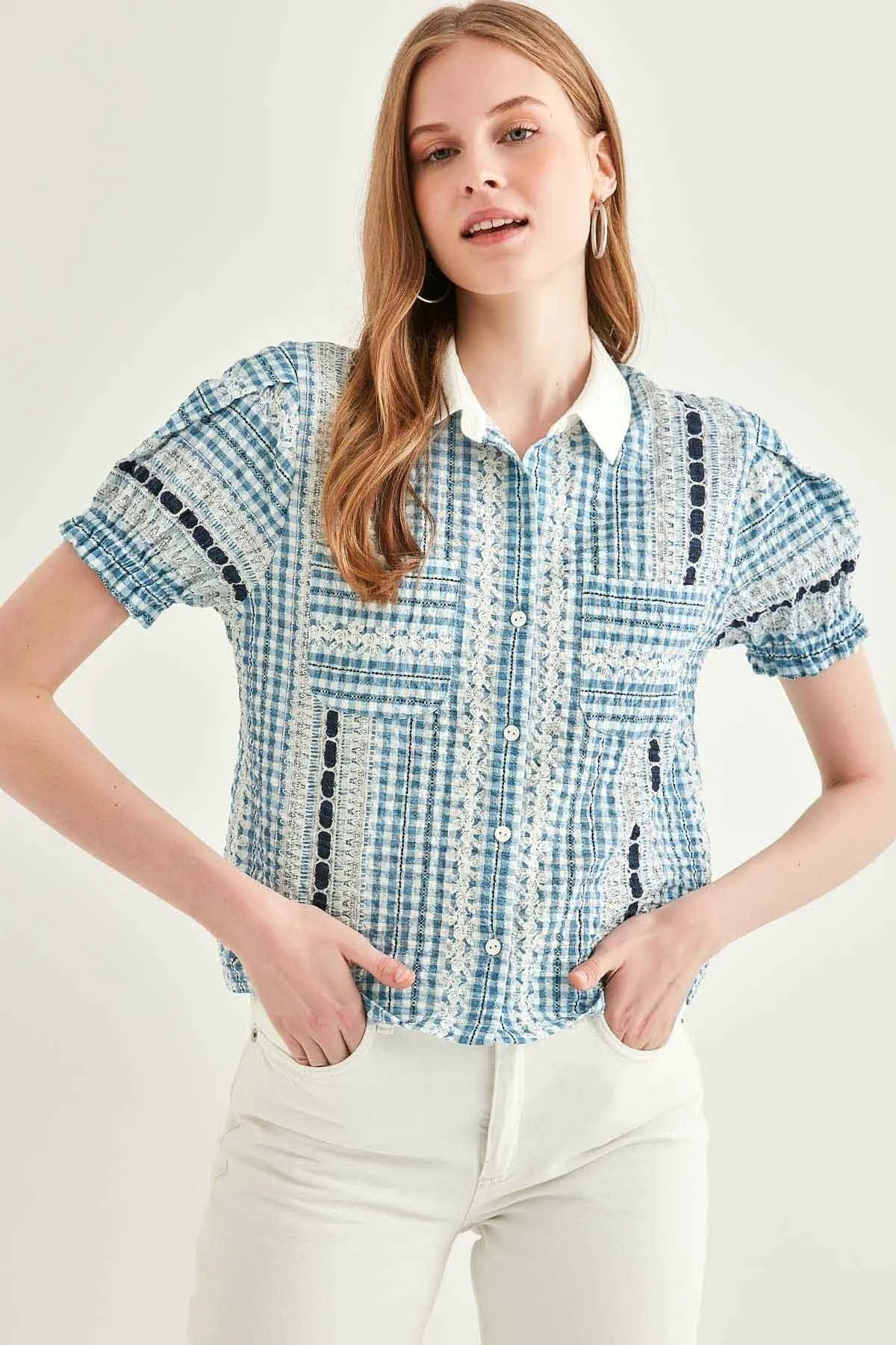 Женские рубашки с карманами и детальным рисунком и белым воротником