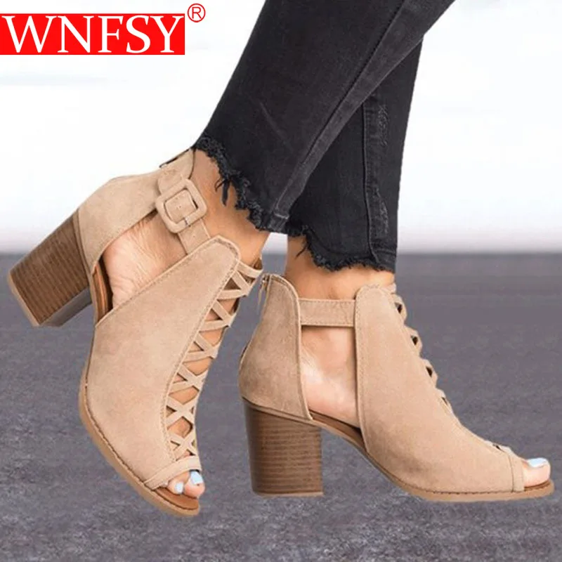 Женские сандалии Wnfsy, модная повседневная обувь с открытым носком на квадратном каблуке, ажурные сандалии-гладиаторы, летние сандалии на высоком каблуке