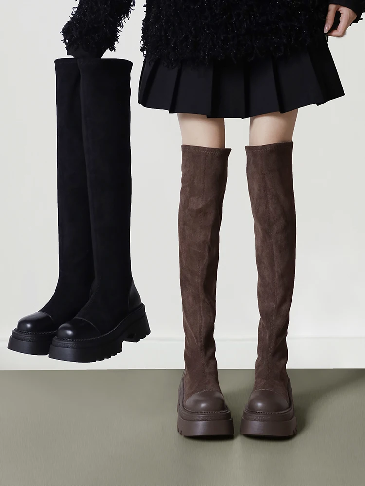 Женские сапоги выше колена, осенние сапоги с круглым носком, на высоком каблуке, из флока, без застежки, в римском стиле, 2023