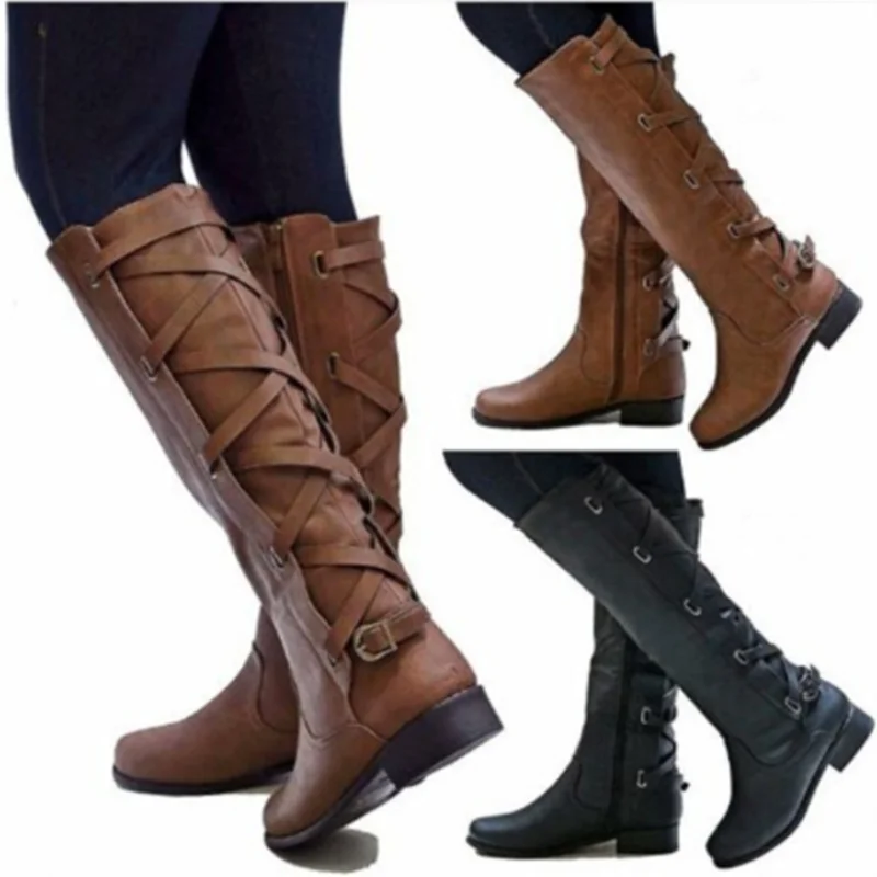 Женские сапоги до колена на толстом каблуке, на молнии, со шнуровкой и пряжкой