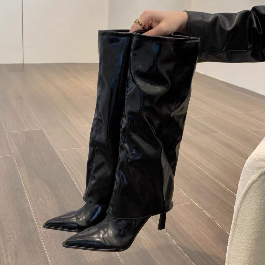 Женские сапоги на высоком каблуке с острым носком, 2025 новая коллекция осень-зима, черные сапоги-ботфорты до колена, длинные сапоги-рыцари 35 чёрный