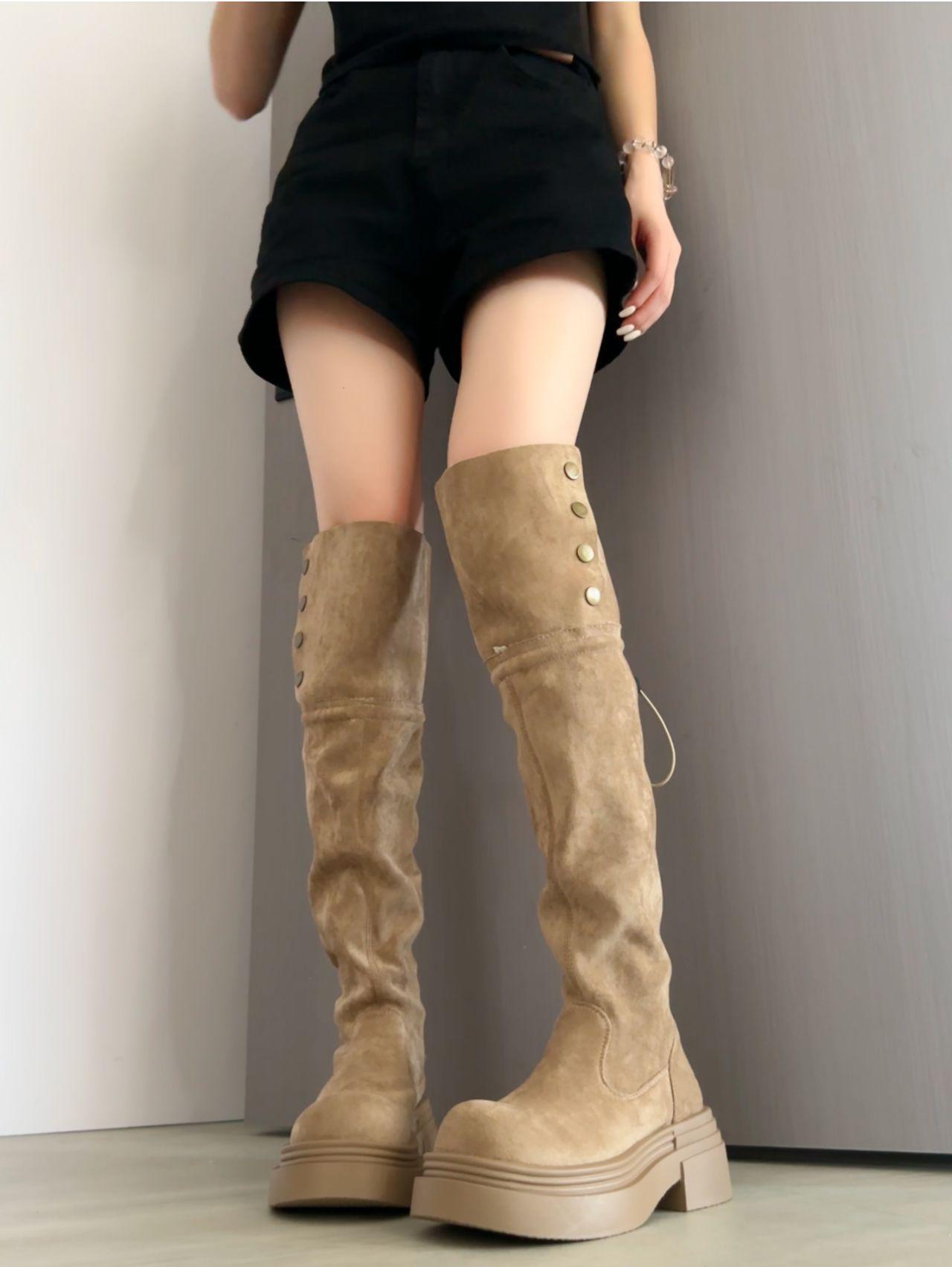 Женские сапоги на толстой подошве 2025 новая осень и зима но до колена замшевые сапоги женские тонкие высокие сапоги для верховой езды 40 хаки