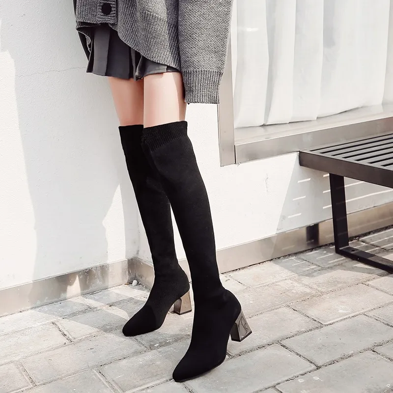 Женские сапоги, новинка 2022, женские сапоги выше колена с острым носком, вязаные сапоги-чулки на каблуке, эластичные облегающие Женские сапог...