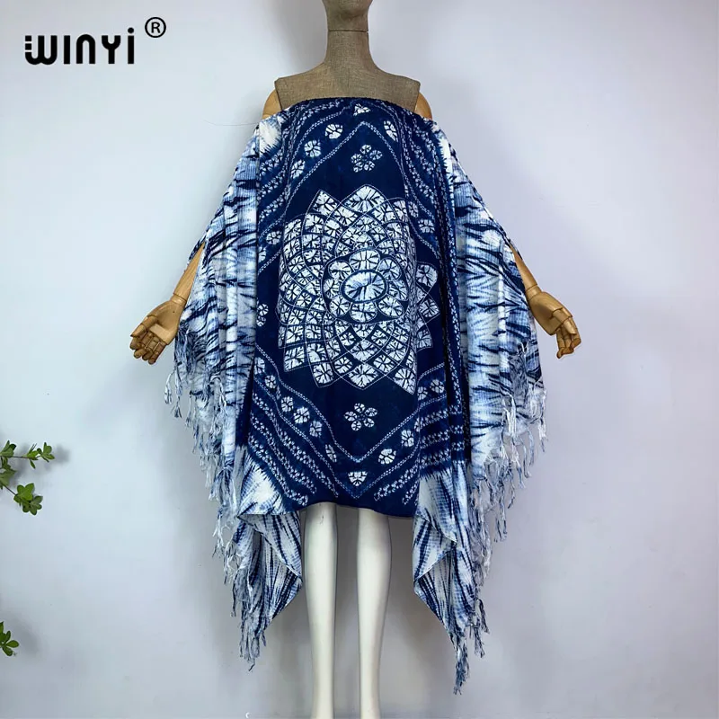 Женские сексуальные Макси-платья WINYI с одним вырезом, летнее платье Бохо с рукавом летучая мышь и принтом, платье с бахромой, Женский кафтан, Пляжная накидка