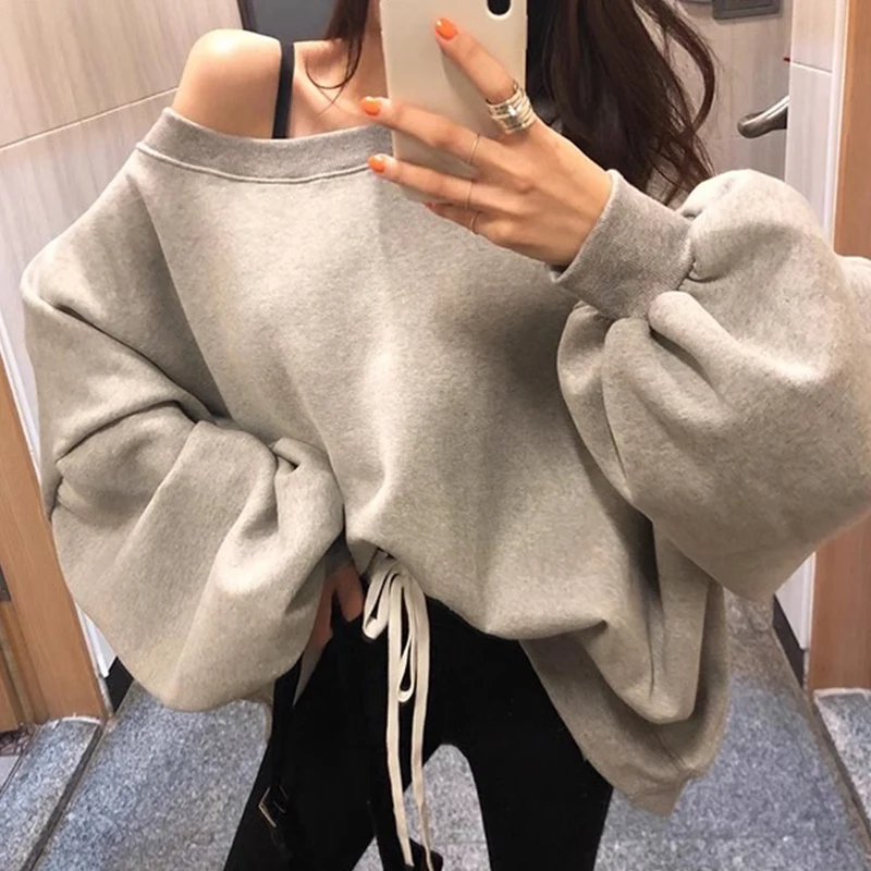 Chic Autumn Winter Thiened Hoodie Women's Long Sve Fce Lined Asymmetrical oulder Bared Loose Fit Versatile Clothing