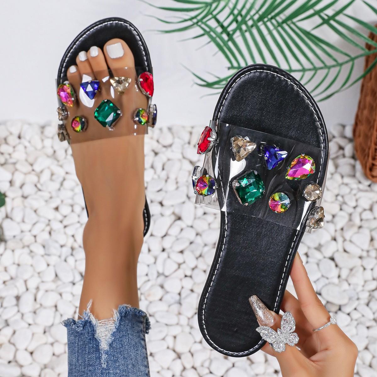 Женские тапочки 2024 Новые летние модные сандалии со стразами и драгоценными камнями Плоские прозрачные тапочки Шлепанцы Женские Zapatos De Mujer 36 чёрный