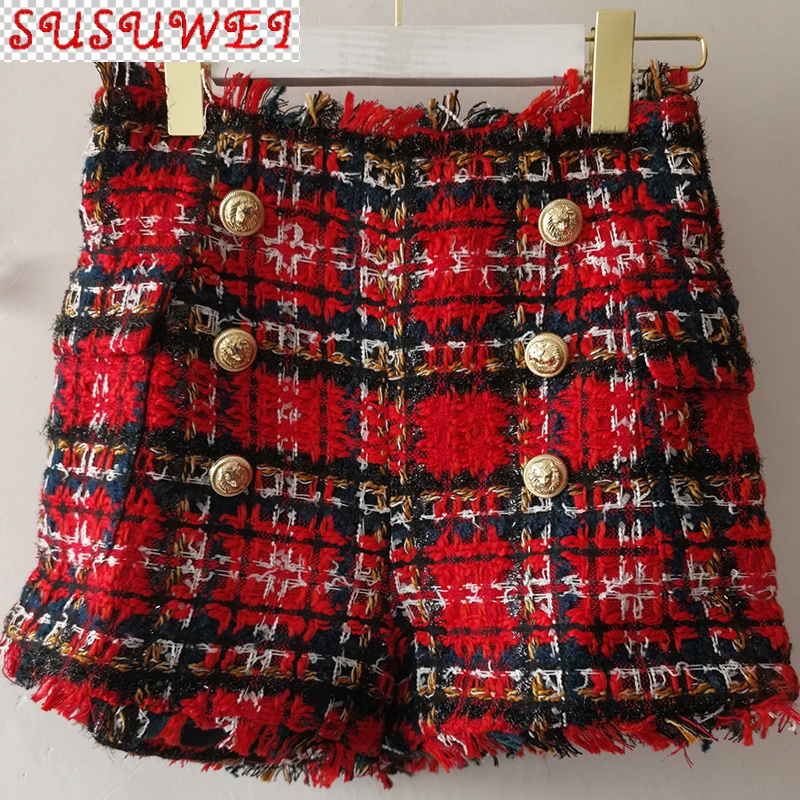 Женские твидовые шорты в клетку, красные клетчатые шорты с золотыми пуговицами, клетчатые твидовые шорты с бахромой и бахромой, Осень-зима ...