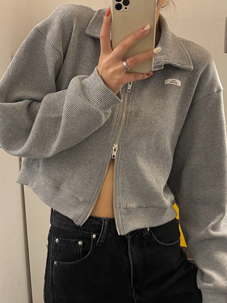 Женские толстовки на молнии, серые корейские модные белые свитшоты оверсайз с длинным рукавом, однотонные укороченные топы Y2K, кардиган