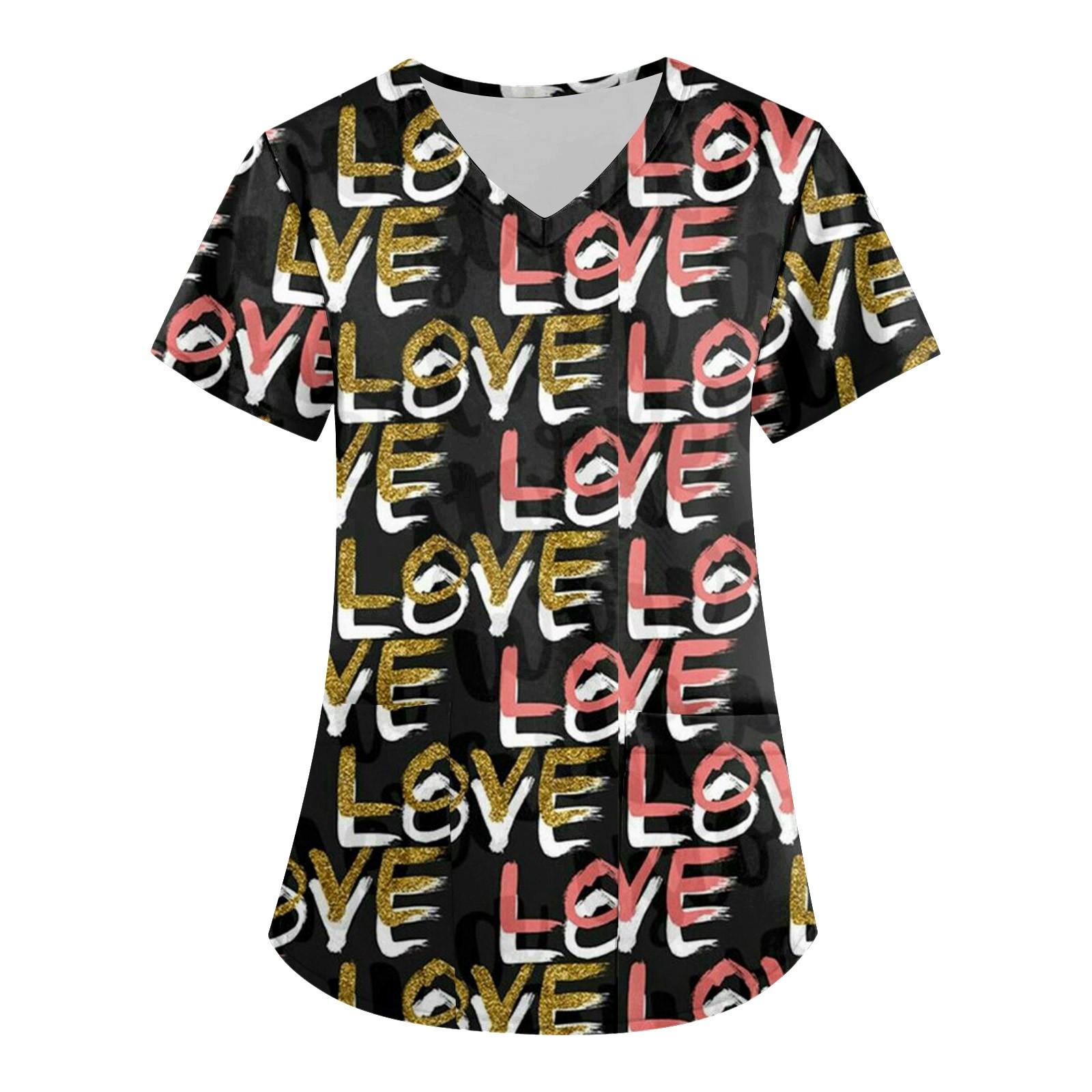 Женские топы с короткими рукавами и v-образным вырезом с принтом в виде сердечек на День святого Валентина, рабочая блузка с карманами L чёрный