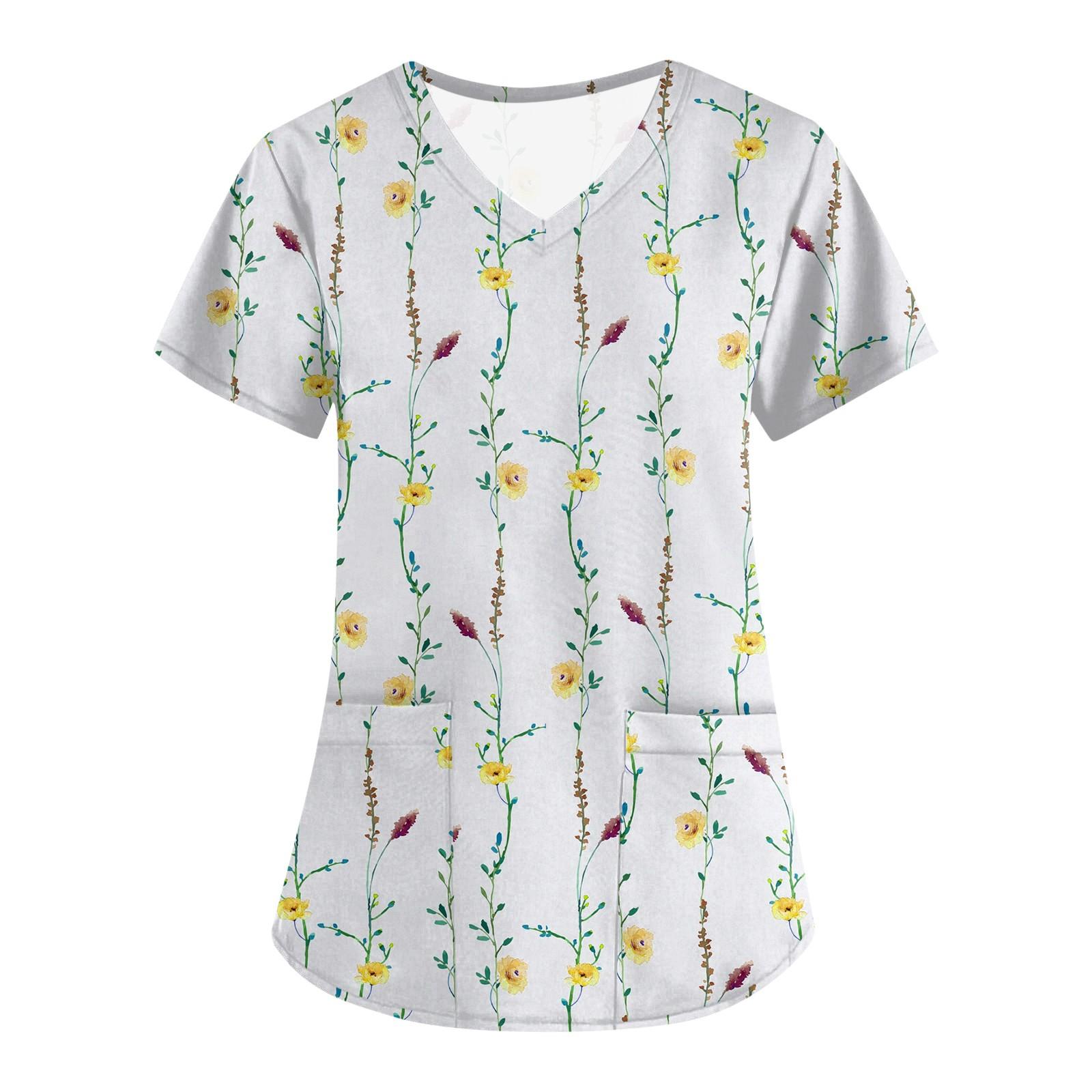 Женские топы с короткими рукавами и v-образным вырезом с цветочным принтом, рабочая униформа, карманная блузка XL жёлтый