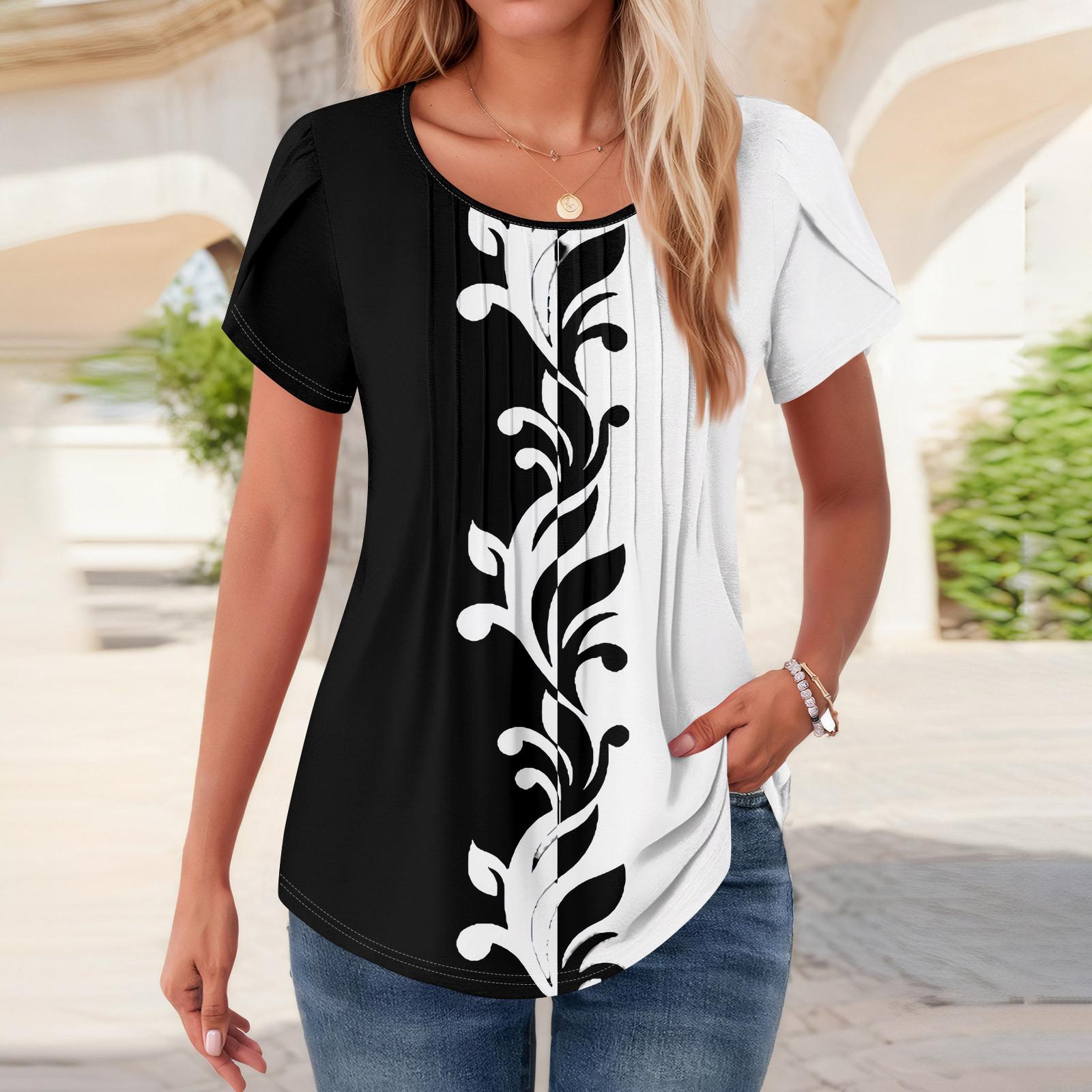 Женские топы с коротким рукавом и круглым вырезом, летние рубашки с цветочным принтом, блузки для женщин, нарядные повседневные L чёрный