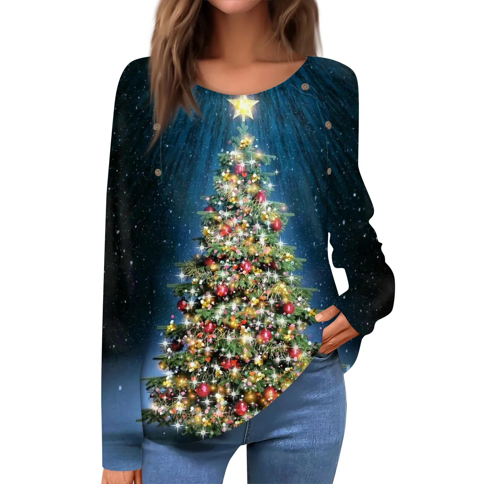 Женские топы с принтом рождественской елки, модные топы с мультяшным принтом, повседневные свободные пуловеры с круглым вырезом и пуговицами для женщин