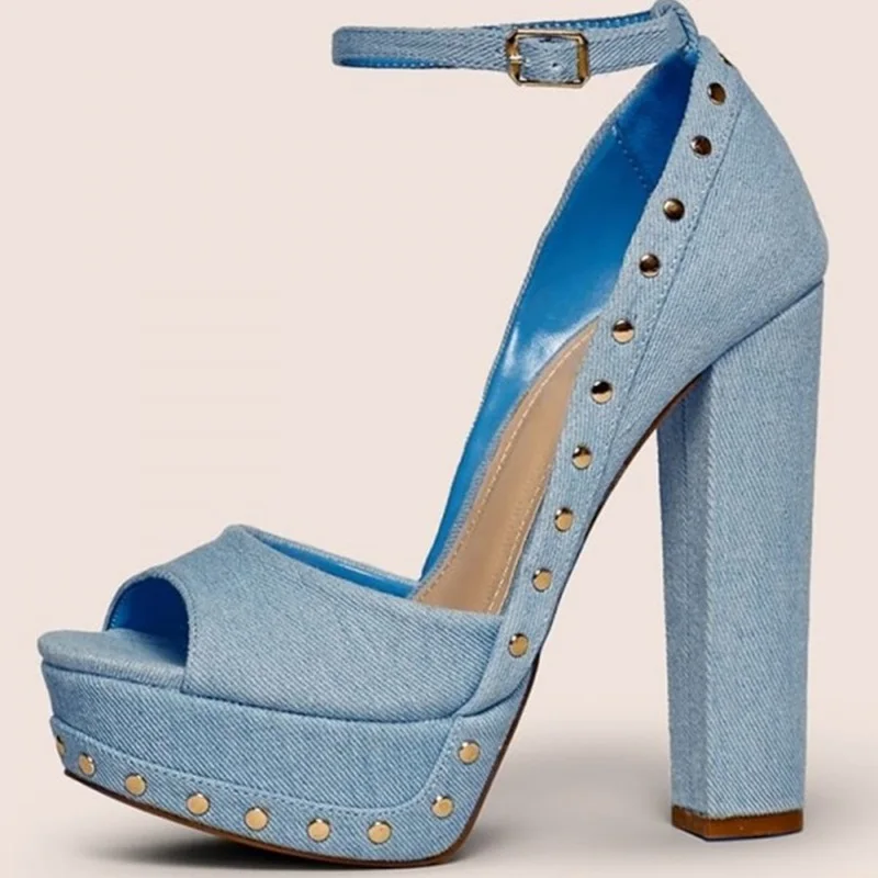 Женские туфли из денима, синие туфли-лодочки на массивном каблуке, с открытым носком, ремешком на щиколотке и платформе, модельные туфли с вы...