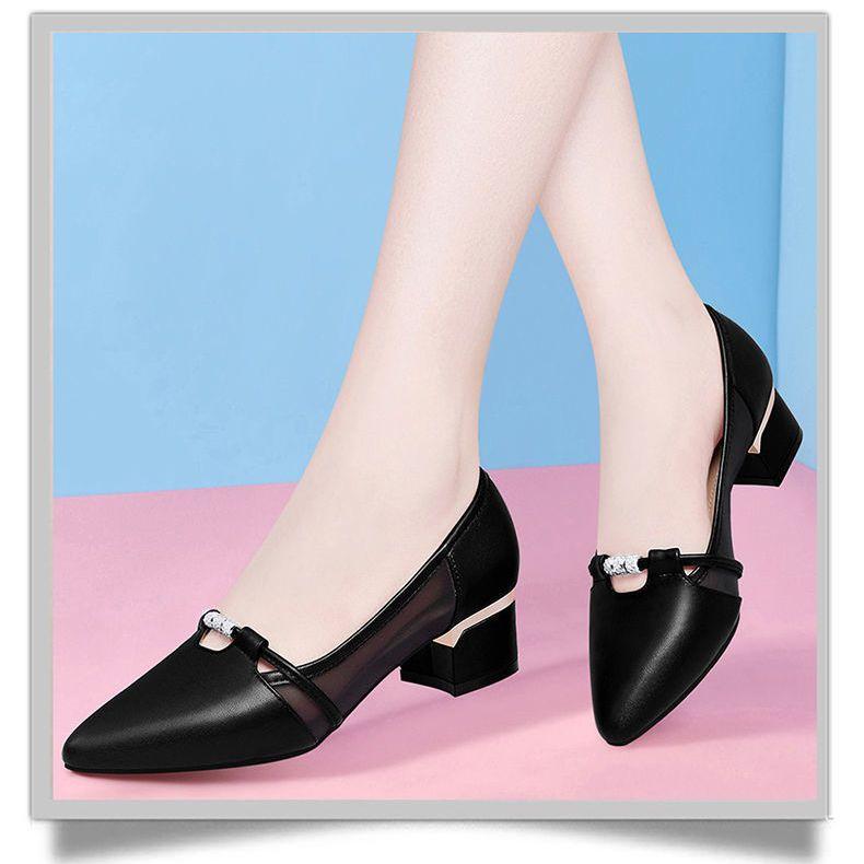 Женские туфли на блочном каблуке, женские туфли из кожи с острым носком, средний каблук, сетка, противоскользящая, с мягкой подошвой, рабочая обувь 35 чёрный