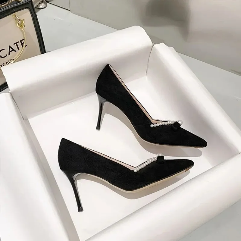 Женские туфли на высоком каблуке, черные удобные туфли с жемчужным бантом и острым носком, 2022