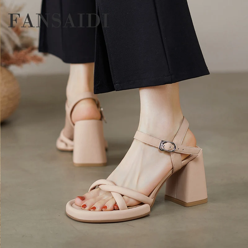 Женские туфли на квадратном каблуке FANSAIDI, серебристые бежевые туфли из натуральной кожи с пряжкой 2023 см, на массивном каблуке для лета, 8,5