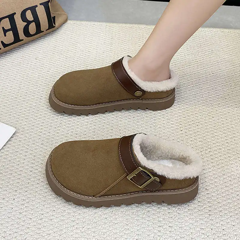 Женские туфли на платформе, без застежки, с круглым носком, зимние классические тапки из флока, в стиле ретро, 2023