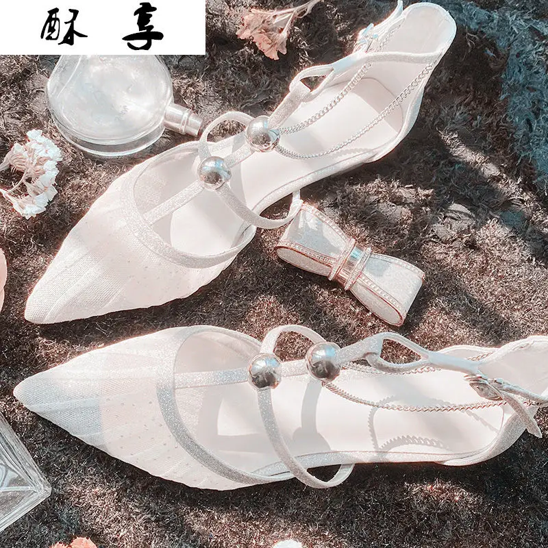 Женские туфли с острым носком Baotou, белые вечерние туфли из сетчатого материала на плоской подошве, с пряжкой «одно слово», весна 2021