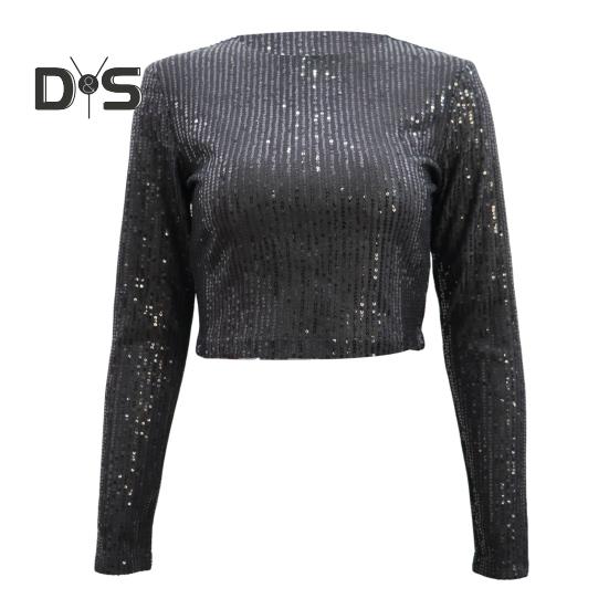 Женские укороченные топы с круглым вырезом, длинным рукавом, украшенные пайетками, свободный крой, облегающие короткие футболки S чёрный